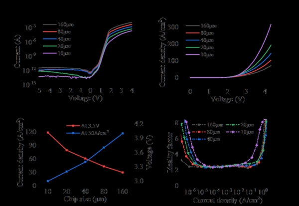 圖2.(a)不同芯片尺寸下的電流-電壓特性;(b)不同芯片尺寸的電流密度-電壓特性;(c)電壓和電流密度與芯片尺寸的關(guān)系;(d)不同芯片尺寸下理想系數(shù)對電流密度的影響