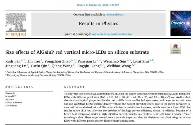 相關(guān)研究成果以Size effects of AlGaInP red vertical Micro-LEDs on silicon substrate為題,發(fā)表在《Results in Physics》上(DOI:10.1016/j.rinp.2022.105449)。