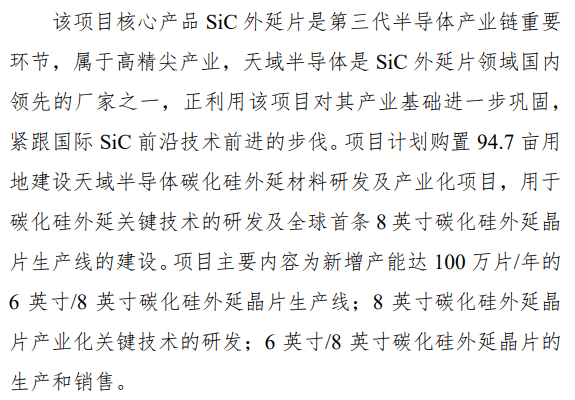 據(jù)披露,項(xiàng)目計(jì)劃購(gòu)置94.7畝用地建設(shè)天域半導(dǎo)體碳化硅外延材料研發(fā)及產(chǎn)業(yè)化項(xiàng)目,用于碳化硅外延關(guān)鍵技術(shù)的研發(fā)及全球首條8英寸碳化硅外延晶片生產(chǎn)線的建設(shè)。項(xiàng)目主要內(nèi)容為新增產(chǎn)能達(dá)100萬(wàn)片/年的6英寸/8英寸碳化硅外延晶片生產(chǎn)線;8英寸碳化硅外延晶片產(chǎn)業(yè)化關(guān)鍵技術(shù)的研發(fā);6英寸/8英寸碳化硅外延晶片的生產(chǎn)和銷售。