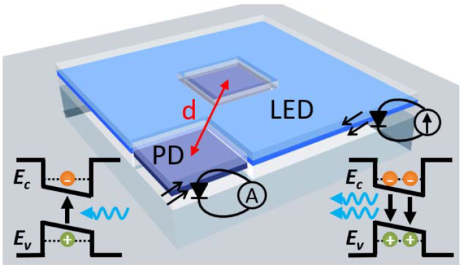李攜曦課題組提出在GaN基外延芯片上集成光源和微型光電探測器,以監(jiān)測發(fā)光強度變化,并通過覆蓋熒光粉實現(xiàn)白光照明。通過理論仿真模擬,探究了探測器位置與探測效率的關(guān)系,并通過實驗驗證了模擬結(jié)果的準(zhǔn)確性。與位于邊緣的探測器相比,位于中心位置的設(shè)計可以實現(xiàn)58%的光強檢測效率提升。研究還發(fā)現(xiàn),片上探測器的探測能力與傳統(tǒng)的外部光電探測器相當(dāng),其響應(yīng)時間小于1μs。相關(guān)成果以“Phosphor-based InGaN/GaN White Light-Emitting Diodes With Monolithically Integrated Photodetectors”為題發(fā)表于IEEE Transactions on Electron Devices。論文第一作者為南科大深港微電子學(xué)院2021級博士生尹嘉豪。