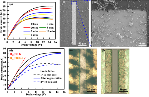 圖3:(a)無柵傳感器輸出曲線隨顆粒物沉積時間變化;(b)和(c)為20秒沉積時間后的傳感器表面SEM圖;(e)PM沉積后和(f)600 °C熱再生后的器件圖。