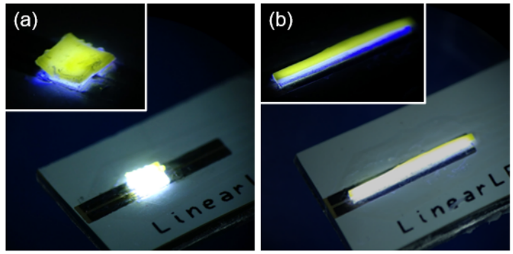 圖6:(a)傳統(tǒng)方形LED和(b)本研究提出的條形LED的光學(xué)圖像。
