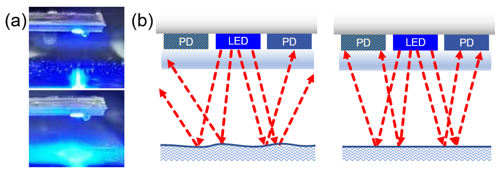 圖5:(a)在光滑和粗糙樣品上測量的器件側(cè)視光學(xué)圖像;(b)在高和低表面粗糙度下發(fā)生的光散射示意圖。