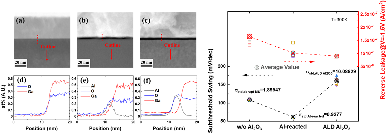 隨著新能源汽車、高鐵以及一些極端環(huán)境下應(yīng)用的需求增加,對應(yīng)相關(guān)領(lǐng)域電力系統(tǒng)的高壓高功率、抗輻射耐高溫的高性能半導(dǎo)體電子器件越來越受到關(guān)注。氧化鎵(β-Ga2O3)具有超寬禁帶寬度(~4.9 eV)、高擊穿電場(~8 MV/cm)、高的熱穩(wěn)定性和化學(xué)穩(wěn)定性等特點,并且可以通過經(jīng)濟高效的熔體法制備技術(shù)進行單晶生長,具有大規(guī)模低成本制造的潛力,被認(rèn)為是未來支撐能源、信息、交通、制造等領(lǐng)域快速發(fā)展的新一代半導(dǎo)體材料。其中,二極整流管是體現(xiàn)Ga2O3優(yōu)勢的一個重要應(yīng)用,于洪宇團隊通過在Ga2O3二極管的肖特基界面插入一層鋁反應(yīng)層,提升了器件金屬半導(dǎo)體界面的質(zhì)量,取得了超低的亞閾值擺幅,降低了漏電,改善了器件的均一性和良率。