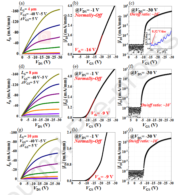 圖2:LG=4 μm, 8 μm, 10 μm 對應(yīng)的SiO2/(111)金剛石MOSFETs (a,d,g) ID-VDS特性,VGS從-40 V到5 V以5 V步長變化 (b,e,h) VDS=-1 V線性坐標下的|ID|-VGS特性 (c,f,i) VDS=-30 V對數(shù)坐標下的|ID|-VGS特性 。