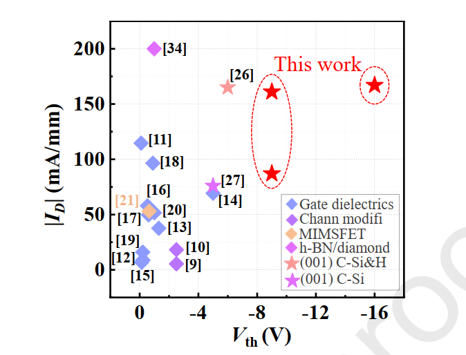 圖3:實驗中C-Si (111) 金剛石MOSFETs器件和報道的 增強型場效應(yīng)晶體管的|ID| -Vth 關(guān)系對比圖。