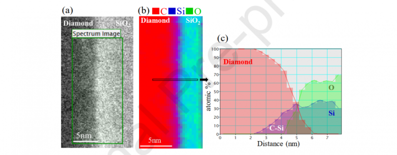 圖5:(a)SiO2/(111)金剛石界面暗場截面STEM圖像 (b) C, Si和O元素的疊加EELS map圖 (c) (b)中黑色方框?qū)?yīng)的C, Si和O的原子百分比map圖
