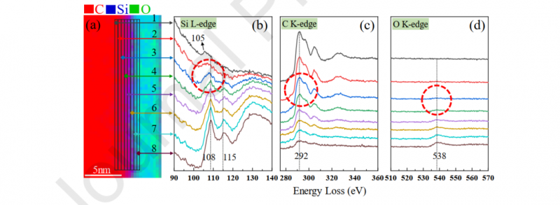 圖6: (a) C, Si和O元素的疊加EELS map圖 (b) Si L-edge (c) C K-edge (d) O K-edge在界面處的EELS能譜。紅色虛線圓圈包含界面區(qū)域的能譜特征。