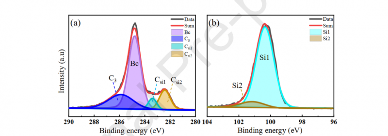 圖7:SiO2/(111)金剛石界面的(a) C1s和(b)Si2p能級的XPS譜。彩色線代表擬合曲線。
