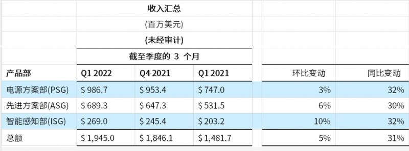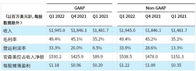 安森美(onsemi,美國(guó)納斯達(dá)克股票代號(hào):ON)公布其2022年第1季度業(yè)績(jī),亮點(diǎn)包括:破紀(jì)錄收入19.45億美元,同比增長(zhǎng)31%;公認(rèn)會(huì)計(jì)原則(GAAP) 攤薄后每股收益為1.18美元,去年同期為0.20美元;破紀(jì)錄非GAAP攤薄后每股收益1.22美元,去年同期為0.35美元;破紀(jì)錄GAAP和非GAAP毛利率49.4%,同比增長(zhǎng)1,420基點(diǎn);破紀(jì)錄GAAP運(yùn)營(yíng)利潤(rùn)率33.3%,環(huán)比增長(zhǎng)730基點(diǎn),同比增長(zhǎng)2,480基點(diǎn);破紀(jì)錄非GAAP運(yùn)營(yíng)利潤(rùn)率33.9%,環(huán)比增長(zhǎng)530基點(diǎn),同比增長(zhǎng)2,060基點(diǎn);過(guò)去12個(gè)月(LTM)自由現(xiàn)金流利潤(rùn)率為20.8%。