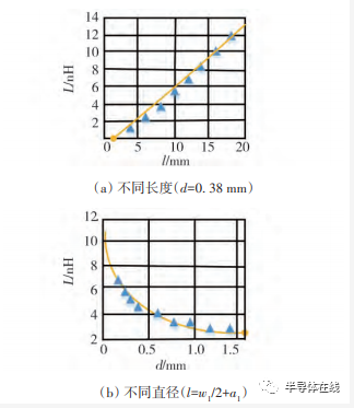 本文中采用 ANSYS Q3D 仿真軟件進(jìn)行模型寄生參數(shù)提取,以單條金屬鍵合線的長(zhǎng)度l和直徑d作為待優(yōu)化參數(shù),仿真分析l和d對(duì)寄生電感的影響特性,如圖3所示。