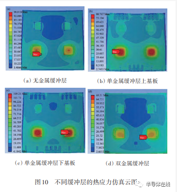 楊寧等的研究發(fā)現(xiàn),不同金屬構(gòu)造的各部分熱應(yīng)力值如表 2所示,而對(duì)應(yīng)的仿真云圖如圖 10所示。其中單層金屬緩沖層因結(jié)構(gòu)的不對(duì)稱性,對(duì)其上下應(yīng)力層需要單獨(dú)分析。