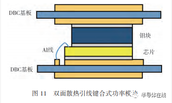 雙面散熱引線鍵合式功率模塊如圖 11 所示。Nakatsu等研究表明,雙面散熱功率模塊的熱阻值比引線鍵合功率模塊約小50%;另外,它還具有優(yōu)異的電學(xué)性能。