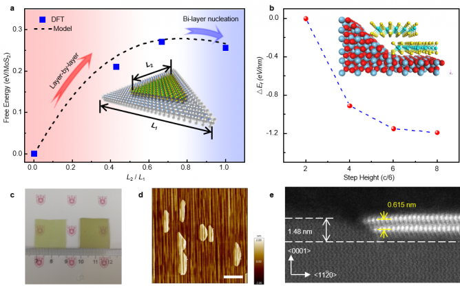 針對該問題,南京大學王欣然教授與東南大學合作,另辟蹊徑,提出了襯底誘導的雙層成核以及“齊頭并進”的全新生長機制,在國際上首次報道了大面積均勻的雙層MoS2薄膜外延生長。研究團隊首先進行了理論計算,發(fā)現(xiàn)雖然單層生長在熱力學上是最穩(wěn)定的,但是通過在藍寶石表面構建更高的“原子梯田”,可以實現(xiàn)邊緣對齊的雙層成核,從而打破了“1+1=2”的逐層生長傳統(tǒng)模式局限(圖3)。研究團隊利用高溫退火工藝,在藍寶石表面上獲得了均勻分布的高原子臺階,成功獲得了超過99%的雙層形核,并實現(xiàn)了厘米級的雙層連續(xù)薄膜。原子力顯微鏡、透射電子顯微鏡、拉曼光譜和熒光光譜等多種表征手段均證明了雙層薄膜的均勻性。進一步,團隊證明了雙層MoS2與藍寶石襯底具有特定的外延關系,以及雙層MoS2的層間具有2H和3R兩種堆垛模式,并在理論上給出了解釋。