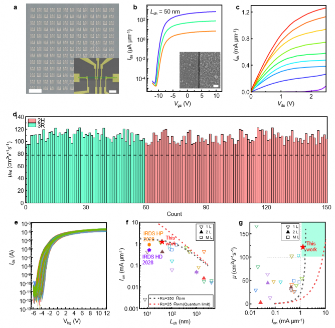 研究團隊進一步制造了雙層MoS2溝道的場效應晶體管(FET)器件陣列,并系統(tǒng)評估了其電學性能(圖4)。相比單層材料,雙層MoS2晶體管的遷移率提升了37.9%,達到~122.6cm2V-1S-1,同時器件均一性得到了大幅度提升。進一步,團隊報道了開態(tài)電流高達1.27 mA/μm的FET,刷新了二維半導體器件的最高紀錄,并超過了國際器件與系統(tǒng)路線圖所規(guī)劃的2028年目標。