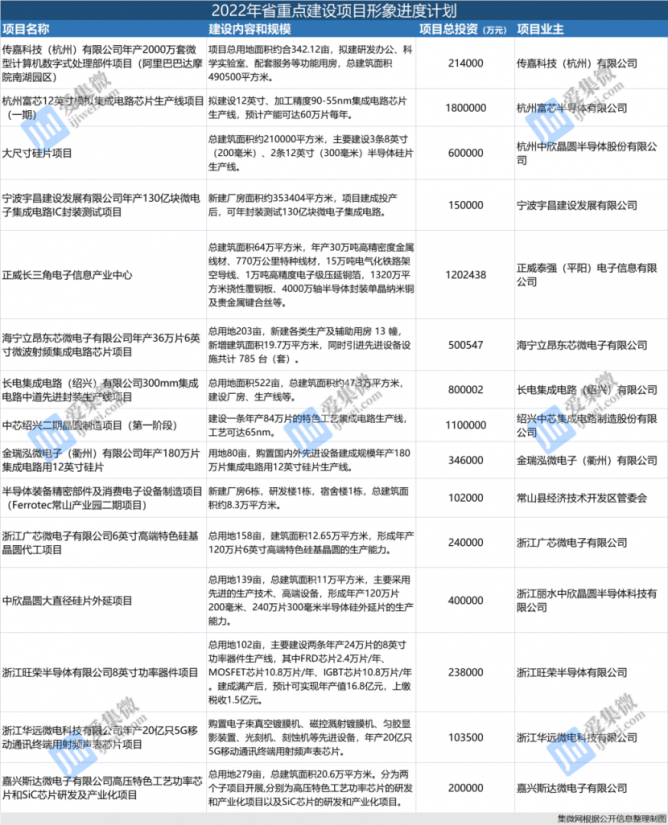 消息顯示,2022年省重點(diǎn)建設(shè)項(xiàng)目形象進(jìn)度計(jì)劃中,包括:杭州富芯12英寸模擬集成電路芯片生產(chǎn)線項(xiàng)目(一期)、杭州中欣晶圓大尺寸硅片項(xiàng)目、長電集成電路(紹興)有限公司300mm集成電路中道先進(jìn)封裝生產(chǎn)線項(xiàng)目、中芯紹興二期晶圓制造項(xiàng)目、金瑞泓微電子(衢州)有限公司年產(chǎn)180萬片集成電路用12英寸硅片、浙江麗水中欣晶圓大直徑硅片外延項(xiàng)目、浙江旺榮半導(dǎo)體有限公司8英寸功率器件項(xiàng)目、浙江廣芯微電子有限公司6英寸高端特色硅基晶圓代工項(xiàng)目、浙江華遠(yuǎn)微電科技有限公司年產(chǎn)20億只5G移動(dòng)通訊終端用射頻聲表芯片項(xiàng)目、嘉興斯達(dá)微電子有限公司高壓特色工藝功率芯片和SiC芯片研發(fā)及產(chǎn)業(yè)化項(xiàng)目等。
