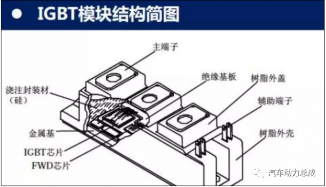 IGBT最常見的形式其實是模塊,IGBT模塊主要由IGBT芯片、FWD芯片、主端子、輔助端子、澆注封裝材、絕緣基板、金屬基、樹脂外蓋和樹脂外殼等組成。多個芯片以絕緣方式組裝到金屬基板上;空心塑殼封裝,與空氣的隔絕材料是高壓硅脂或者硅脂,以及其他可能的軟性絕緣材料。從功能安全角度來看:(1)多個IGBT芯片并聯(lián),IGBT的電流規(guī)格更大。(2)多個IGBT芯片按照特定的電路形式組合,如半橋、全橋等,可以減少外部電路連接的復(fù)雜性。(3)多個IGBT芯片處于同一個金屬基板上,等于是在獨立的散熱器與IGBT芯片之間增加了一塊均熱板,工作更可靠。(4)模塊中多個IGBT芯片之間的連接與多個分立形式的單管進行外部連接相比,電路布局更好,引線電感更小。模塊的外部引線端子更適合高壓和大電流連接。