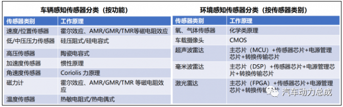 汽車傳感器分為車輛感知和環(huán)境感知兩大類,對應(yīng)的芯片也可以據(jù)此分為兩類。車輛感知傳感器主要有速度/位置傳感器、低/中壓壓力傳感器、高壓傳感器、加速度傳感器、角速度傳感器、磁力計和溫度傳感器。環(huán)境感知傳感器主要有氧、氣體傳感器、車載攝像頭、超聲波雷達、毫米波雷達和激光雷達。
