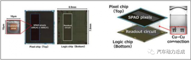 從結(jié)構(gòu)上看,這顆激光雷達接收傳感器共有兩層,上層采用了SPAD(單光子雪崩二極管)技術(shù),用于感知反射進傳感器的激光;下層則是邏輯芯片,使用直接飛行時間(D-ToF)技術(shù),就能實現(xiàn)測距。在性能上,索尼在1/2.9英寸的傳感器面積下放進了11萬個SPAD像素,其分辨率為189×600,呈現(xiàn)出一個矩形區(qū)域。而每一個SPAD像素的尺寸僅為10微米x10微米。