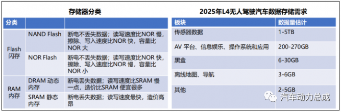 汽車傳感器存儲器分為閃存和內(nèi)存,閃存分為NAND Flash 和NOR Flash,內(nèi)存分為DRAM 和SRAM。汽車上產(chǎn)生數(shù)據(jù)的主要包括ADAS(自動駕駛)和信息娛樂系統(tǒng)兩個板塊,智能化帶來的海量數(shù)據(jù)將增加汽車存儲器的需求,根據(jù)Counterpoint Research 估計,未來十年,單車存儲容量將達到2TB-11TB。