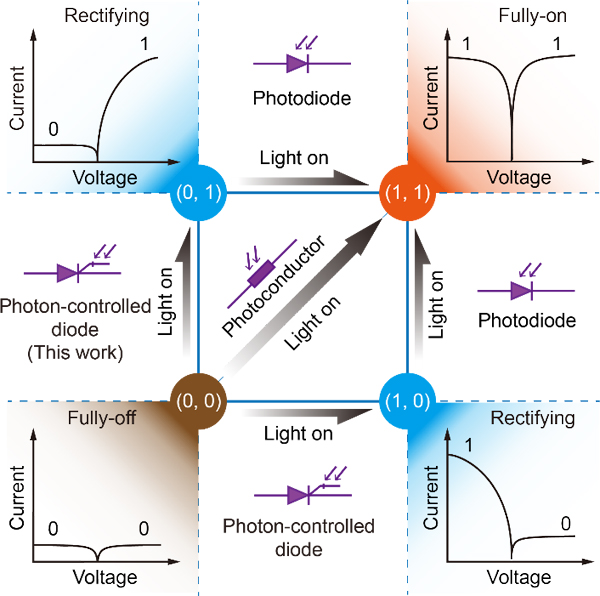 光電探測器是一類通過電信號探測光信號的重要半導體器件,包括光電二極管、光電晶體管和光電導等。盡管種類繁多,但光電探測器的信號狀態(tài)在光照前后可歸納為全關態(tài)(0,0)、全開態(tài)(1,1)以及整流態(tài)(0,1)或(1,0)三類(圖2)。已往的光電探測器可以實現(xiàn)兩種狀態(tài)的相互轉換,以光電二極管為代表的器件實現(xiàn)由整流態(tài)向全開態(tài)轉換,以及以光電導和光電晶體管為代表的器件實現(xiàn)由全關態(tài)向全開態(tài)轉換。從圖中的電學行為的完備性出發(fā),理論上應存在一類由全關態(tài)向整流態(tài)轉換的新型器件。