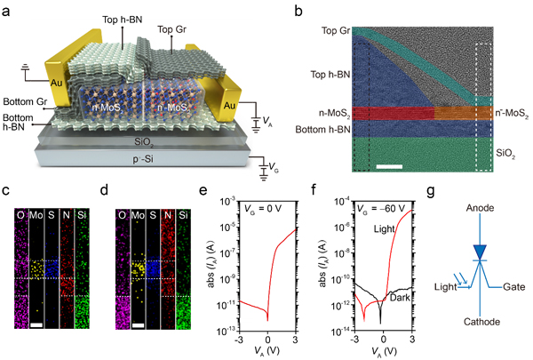 圖3. 二硫化鉬光控二極管。a. 器件結構示意圖;b. 局部截面TEM圖像;c. 圖b白色虛線區(qū)域元素分布圖;d. 圖b黑色虛線區(qū)域元素分布圖;e. IA-VA特性(VG = 0 V);f. 在暗態(tài)和光照下的IA-VA特性(VG = -60 V);g. 等效電路圖。