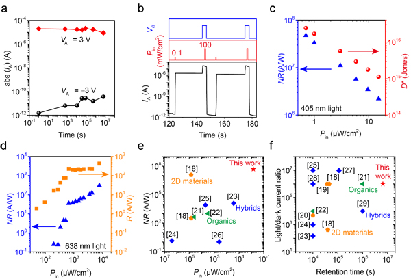 圖4. 光控二極管的光電存儲特性。a. 存儲特性;b. 開關特性;c. 405 nm光非易失響應度和探測度;d. 638 nm光非易失響應度和響應度;e-f. 基于不同材料體系的器件性能對比。