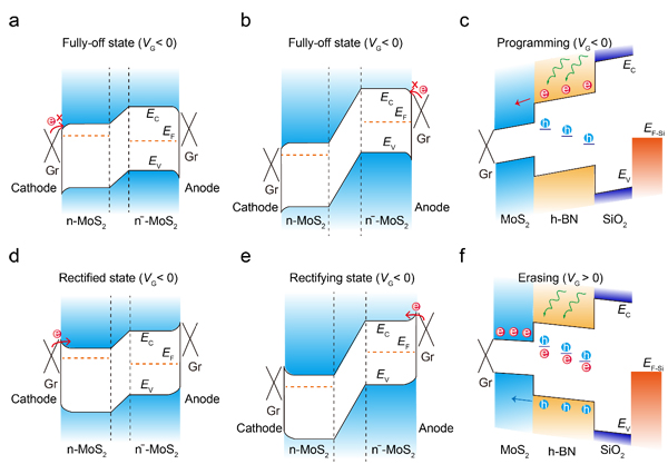 圖5. 工作機制。a. 全關態(tài)(VA > 0);b. 全關態(tài)(VA < 0);c. 數(shù)據寫入過程;d. 整流態(tài)(VA > 0);e. 整流態(tài)(VA < 0);f. 數(shù)據擦除過程。