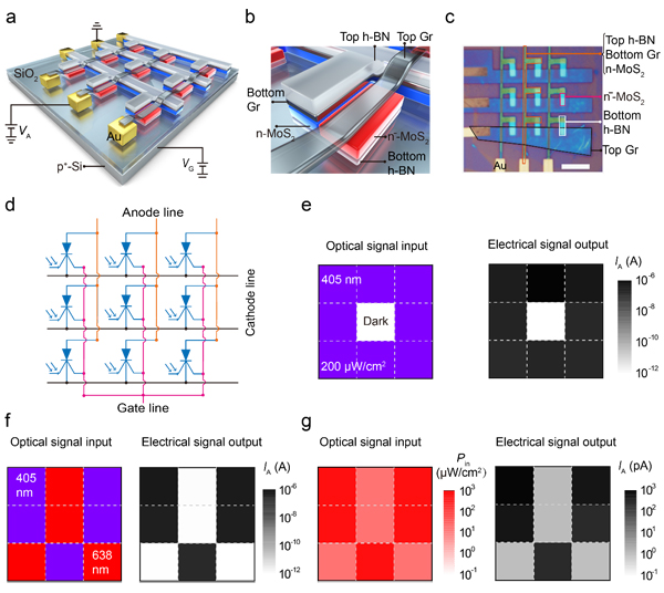 通過器件能帶結構的分析,研究人員闡明了器件的工作原理。光控二極管本質上是由位于正和負極的兩個石墨烯/二硫化鉬肖特基結和位于溝道的二硫化鉬n/n-結串聯(lián)而成。在負柵壓下,處于截止態(tài)的肖特基結將使器件處于全關態(tài);在光照時,氮化硼光柵層將捕獲光生載流子,從而屏蔽柵壓的調控作用,使肖特基結處于導通態(tài),進而使得二硫化鉬n/n-結的整流特性得以呈現(xiàn),器件處于整流態(tài)(圖5)。研究人員進一步設計構筑了3×3像素的光電存儲陣列,首次在無選通器件的條件下展現(xiàn)了優(yōu)異的抗串擾能力;同時,基于器件對不同波長和強度光信號響應的差異,研究人員演示了陣列對光信號的探測及處理功能,表明了光控二極管具有實現(xiàn)高集成度、低功耗和智能化光電系統(tǒng)的極大潛力(圖6)。