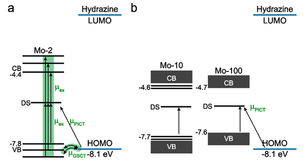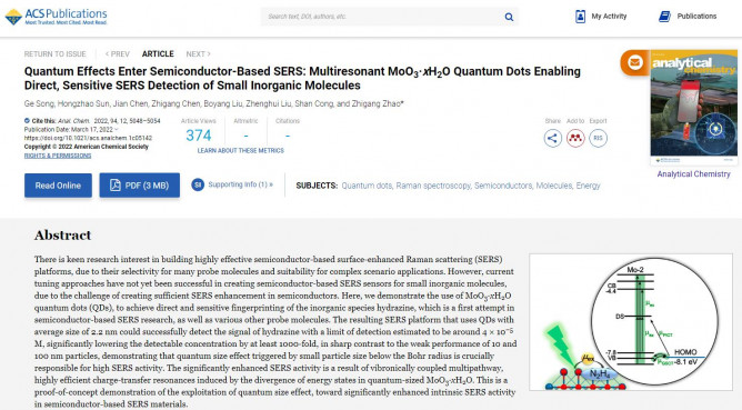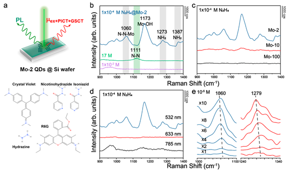 基于這一研究目標(biāo),中科院蘇州納米所趙志剛研究員團(tuán)隊(duì)設(shè)計(jì)了一系列不同尺寸的氧化鉬納米晶和量子點(diǎn),發(fā)現(xiàn)小尺寸的量子點(diǎn)在晶格缺陷和尺寸效應(yīng)的雙重作用下SERS性能顯著提升,提出了基于多重共振耦合電荷轉(zhuǎn)移路徑實(shí)現(xiàn)高效化學(xué)增強(qiáng)效應(yīng)的SERS作用機(jī)制,并實(shí)現(xiàn)了對(duì)無(wú)機(jī)小分子聯(lián)氨(N2H4)的低濃度檢測(cè)。