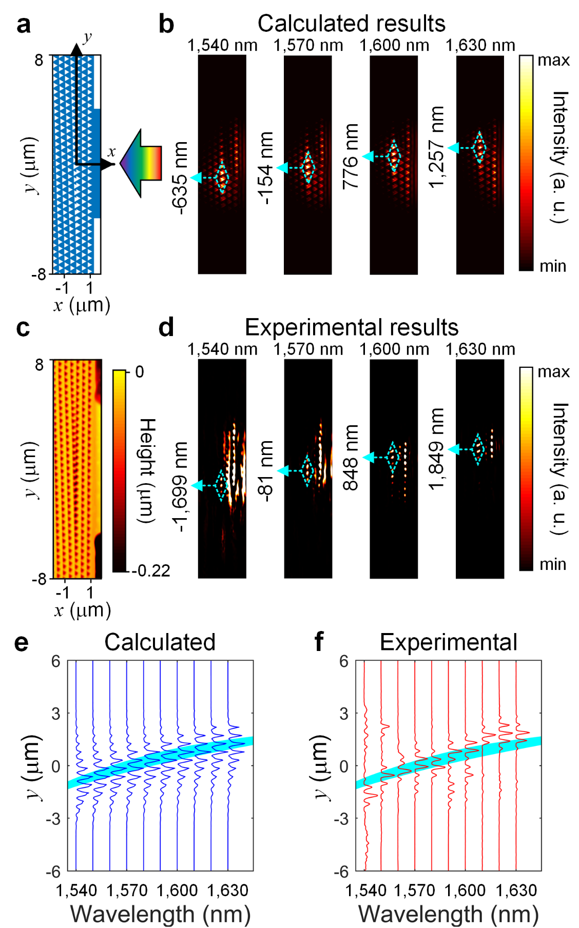 圖2 (a)樣品設(shè)計(jì)圖示例;(b)計(jì)算的不同波長(zhǎng)在合成維度光子晶體表面的光強(qiáng)分布;(c)樣品原子力顯微鏡形貌圖;(d)實(shí)驗(yàn)測(cè)得的不同波長(zhǎng)在合成維度光子晶體表面的表面光強(qiáng)分布,不同波長(zhǎng)被囚禁在界面不同晶格位置。