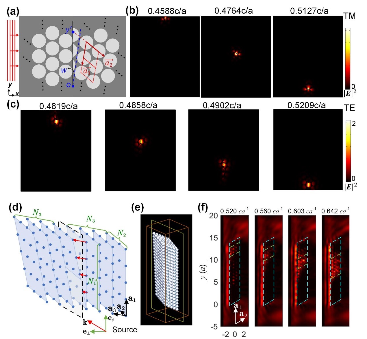 圖3 光子晶體晶格旋轉(zhuǎn)實(shí)現(xiàn)的拓?fù)洳屎?,不同頻率的拓?fù)鋺B(tài)囚禁在芯片上不同位置(a-c);空間合成維度光子晶體拓?fù)洳屎?,不同頻率的拓?fù)鋺B(tài)囚禁在空間不同位置(d-f)。