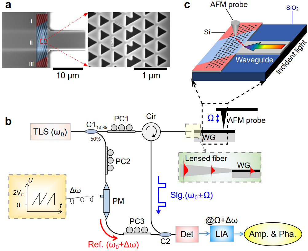 圖1 (a)樣品電鏡圖;(b)樣品測(cè)試示意圖;(c)散射式近場(chǎng)光學(xué)顯微鏡實(shí)驗(yàn)裝置圖。