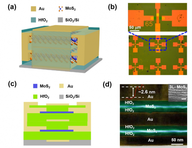 圖1. (a) 基于MoS2的MBC-FET三維結(jié)構(gòu)示意圖;(b) MBC-FET器件陣列的光學(xué)圖;(c) 基于MoS2的MBC-FET的截面示意圖;(d)MBC-FET的截面高清TEM表征,左上角的內(nèi)嵌圖是三層MoS2的AFM,右上角的內(nèi)嵌圖是三層MoS2截面的高清TEM表征。