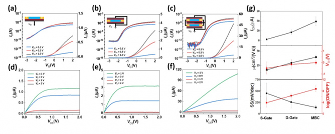 圖2. (a)-(d), (b)-(e), (c)-(f) 單柵FET,雙柵FET以及MBC-FET的轉(zhuǎn)移特性和輸出特性性能對(duì)比;(g) 單柵FET,雙柵FET以及MBC-FET的電學(xué)性能對(duì)比。