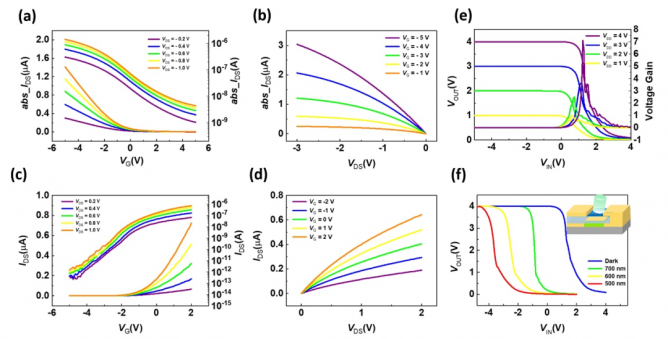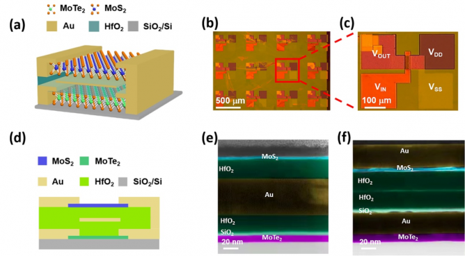 獨(dú)立測(cè)試的MoTe2 晶體管和MoS2 晶體管的電學(xué)特性如圖(a)-(d)所示,兩種晶體管均展現(xiàn)了良好p型特性和n型特性。接下來就是C-FET結(jié)構(gòu)的反相器測(cè)試,當(dāng)給中間的公共柵電極施加負(fù)電壓的時(shí)候,MoS2 溝道被關(guān)斷,MoTe2溝道被開啟,VOUT輸出高電平;當(dāng)公共柵電極施加正電壓,MoS2溝道被開啟,MoTe2溝道被關(guān)斷,VOUT輸出低電平。圖3(e) 展示了在偏壓1V到4V下,此C-FET器件的電壓轉(zhuǎn)移特性和電壓增益。在VDD為4V時(shí),C-FET可以獲得7V/V的較好電壓增益。最后,作者還證明了C-FET的閾值開關(guān)電壓可以由不同波長的光信號(hào)來調(diào)控,這也證明了C-FET結(jié)構(gòu)在傳感和光電領(lǐng)域的潛在應(yīng)用。