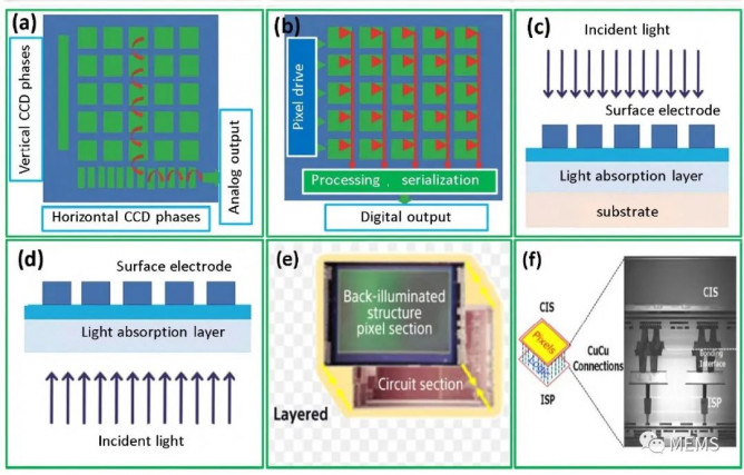 圖像傳感器工作原理和結(jié)構(gòu)示意圖:(a)、(b)、(c)和(d)分別為CCD、CMOS、前照式圖像傳感器結(jié)構(gòu)和背照式圖像傳感器結(jié)構(gòu);(e)堆棧式CMOS圖像傳感器;(f)具有Cu-Cu雜化鍵合的新型堆棧式背照CMOS圖像傳感器及器件截面圖