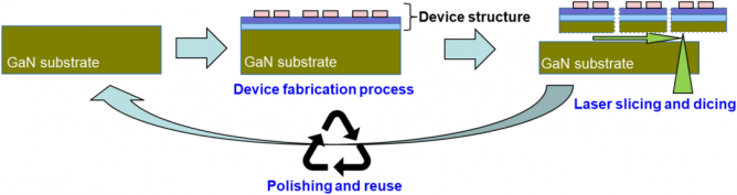 根據(jù)文獻(xiàn)介紹,新開發(fā)的GaN襯底減薄技術(shù)可以在器件制造之后采用激光工藝進(jìn)行減薄,以最大幅度減少GaN襯底的消耗。實驗表示,每100毫米厚的GaN襯底可以制作一個器件層,而以前每個400 mm厚的GaN基板只能獲得一個器件層,相比之下減少了300%的損耗。值得一提的是,所消耗的GaN襯底的量將僅為切片器件層的厚度,并可以通過拋光去除以重新使用。換句話說,使用該新技術(shù)有望實現(xiàn)GaN襯底0耗損!