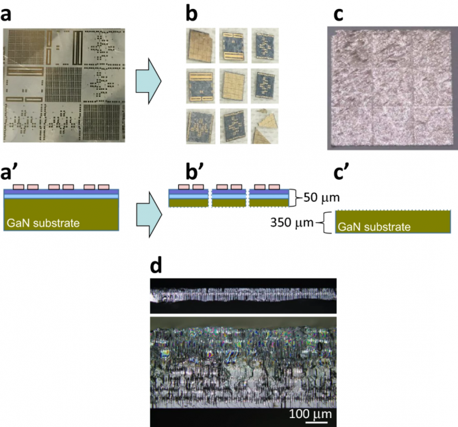 其實,該新技術(shù)和傳統(tǒng)的Smart Cut™技術(shù)有相似之處,Smart Cut™技術(shù)采用的是離子注入法切割,可切割出亞微米厚度的非常薄的GaN層。但激光切割技術(shù)很難切出如此薄的GaN層,因為GaN在激光切割過程中會被分解。為此,該團(tuán)隊開創(chuàng)了背面激光照射法來剝離器件層。
