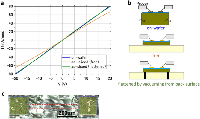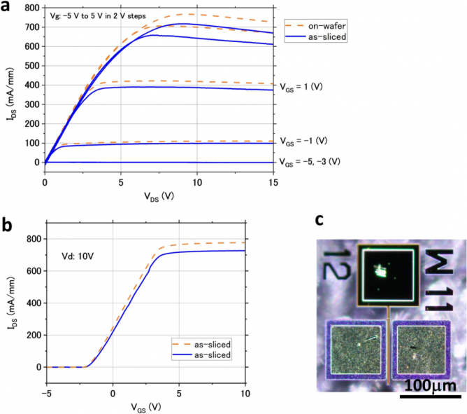 該技術(shù)已被證實即使在激光切片后,GaN-on-GaN HEMT仍可正常工作,并且切割后HEMT的靜電性能沒有顯著變化。這意味著即使在設(shè)備制造后也可以應(yīng)用激光切片工藝。同時,它也可以用作半導(dǎo)體工藝,用于制造厚度約為10mm的薄器件,且無需拋光GaN襯底。