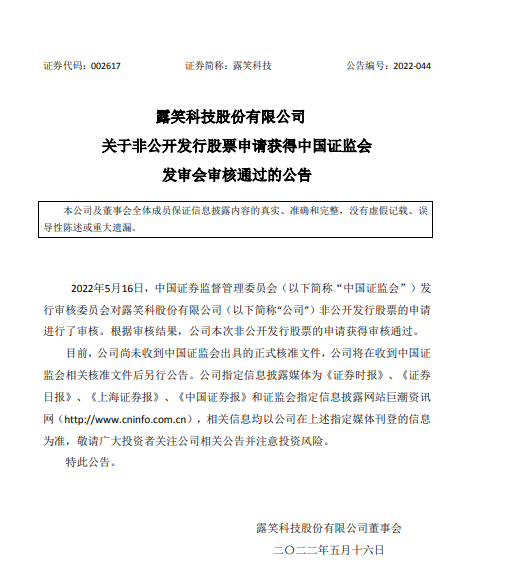 5月16日,露笑科技公布稱,中國證監(jiān)會發(fā)行審核委員會對公司非公開發(fā)行股票的申請進行了審核。根據(jù)審核結(jié)果,公司本次非公開發(fā)行股票的申請獲得審核通過。
