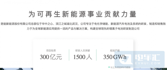 資料顯示,楚能新能源楚能新能源股份有限公司成立于2021年8月26日,總部位于武漢。楚能新能源官網(wǎng)自我介紹稱(chēng):公司專(zhuān)注于電化學(xué)儲(chǔ)能、新能源汽車(chē)電池及系統(tǒng)的研發(fā)、制造和銷(xiāo)售 致力于為全球新能源應(yīng)用提供一流的產(chǎn)品與解決方案,構(gòu)建全球領(lǐng)先的鋰離子電池研發(fā)制造公司。5年內(nèi)計(jì)劃項(xiàng)目總投資300億元、研發(fā)人員超1500名、規(guī)劃產(chǎn)能350GWh。