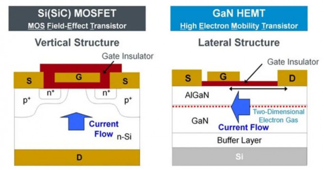 ▲ 圖 1:Si/SiC 和 GaN HEMT 器件的結(jié)構(gòu)比較