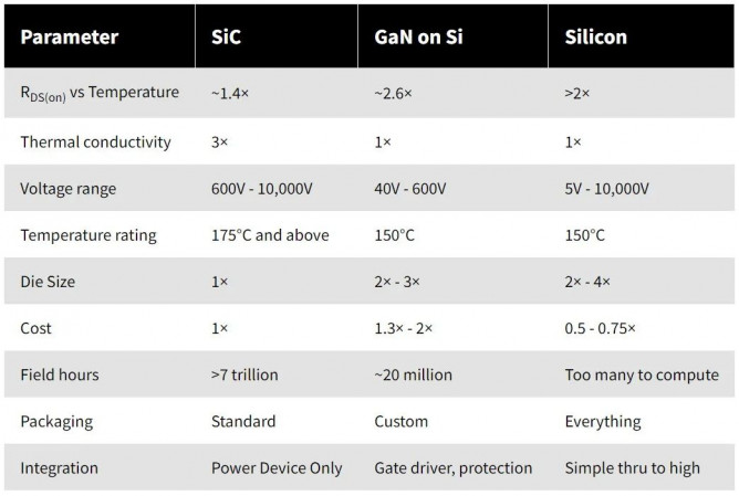 ▲ 圖 2:Si、SiC 和 GaN-on-Si 之間的技術(shù)性能比較
