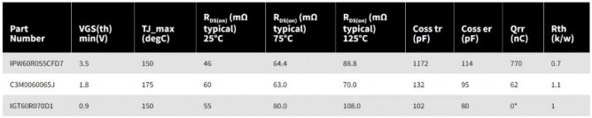 圖 3 顯示了 IPW60R055CFD7 (Si)、C3M0060065J (SiC) 和 IGT60R070D1 (GaN) 之間的直接比較。