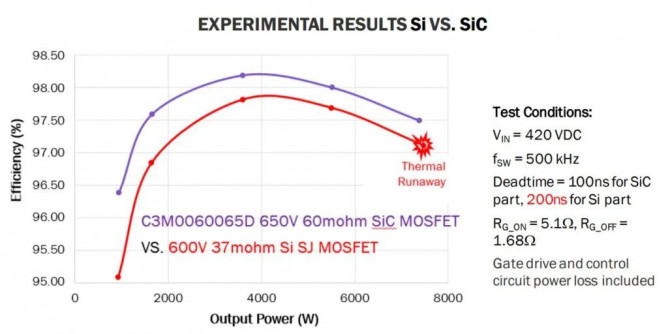 ▲ 圖 7:Si 與 SiC 在效率和輸出功率方面的實驗結(jié)果