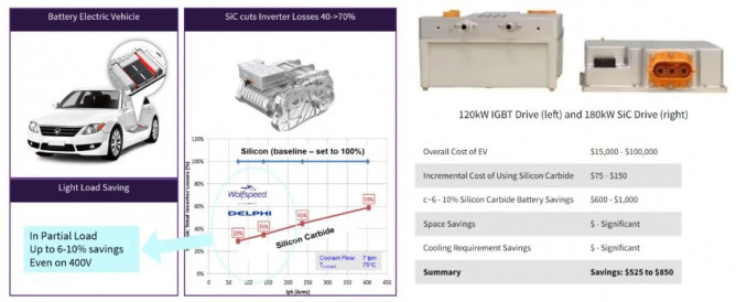 ▲ 圖2:SiC 逆變器的損耗遠(yuǎn)低于 Si 基系統(tǒng)(如圖)。除上述所列獲益外,占用空間和散熱需求的減少還可帶來(lái)成本節(jié)?。ü?jié)省程度因車(chē)型而異)