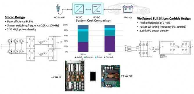 ▲ 圖4:在全系統(tǒng)采用 Si 與采用 SiC 的22 kW 雙向AC-DC 快速充電機(jī)比較中,Wolfspeed SiC 將損耗減少了 42%,功率密度增加了 51%,系統(tǒng)成本更低