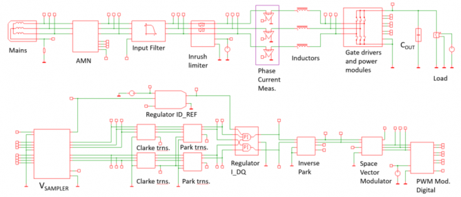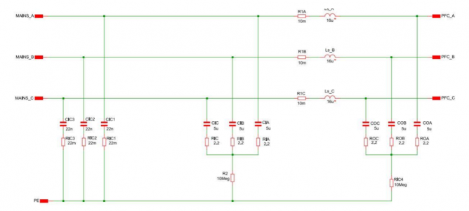 作為仿真的一部分,我們需要基本的、針對(duì)輸入濾波的差模傳導(dǎo)干擾(CE)的驗(yàn)證,可以在電源和濾波器之間插入人工電源網(wǎng)絡(luò)(AMN,Artificial Mains Network)或阻抗穩(wěn)定網(wǎng)絡(luò)(LISN,Line Impedance Stabilization Network,根據(jù)CISPR22)。對(duì)于這塊內(nèi)容,我們不在本系列進(jìn)行討論。電網(wǎng)的模型也包括了影響控制的交流電網(wǎng)阻抗,因此加入仿真可以提高仿真的精確度。
