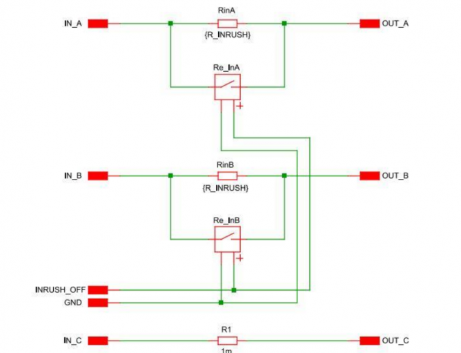浪涌電流保護(hù)是EV充電系統(tǒng)中關(guān)鍵的一環(huán),我們也需要為這一環(huán)做好仿真。該模型的實(shí)現(xiàn)并不復(fù)雜,典型的三相系統(tǒng),其中兩相由電阻和繼電器并聯(lián)構(gòu)成,如圖3。由于系統(tǒng)并不涉及到中性線,所以不必在第三相上增加電阻。(圖1中的電阻R代表了連接產(chǎn)生的等效電阻。)